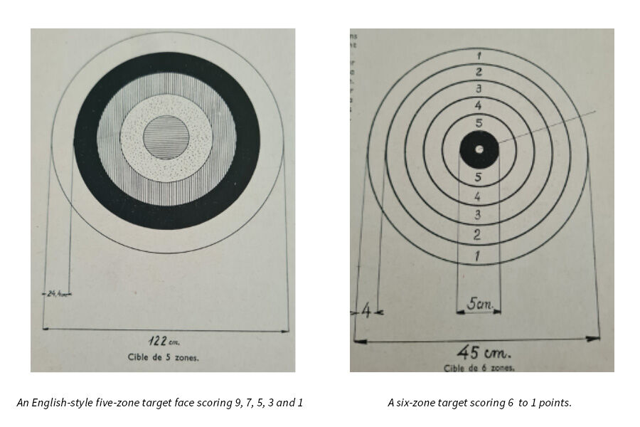 Targets used the English style of scoring – 9, 7, 5, 3 and 1 points – and the target size at all distances except 30 metres, where it was 80 centimetres, was 48 inches.
