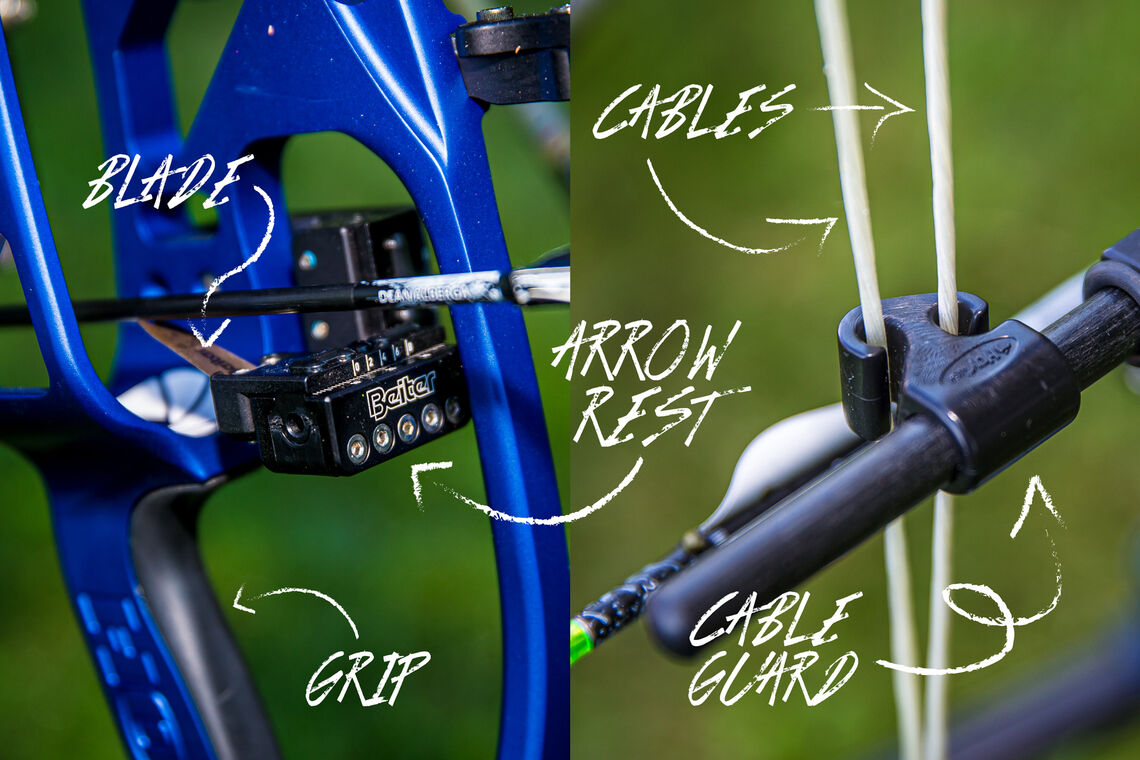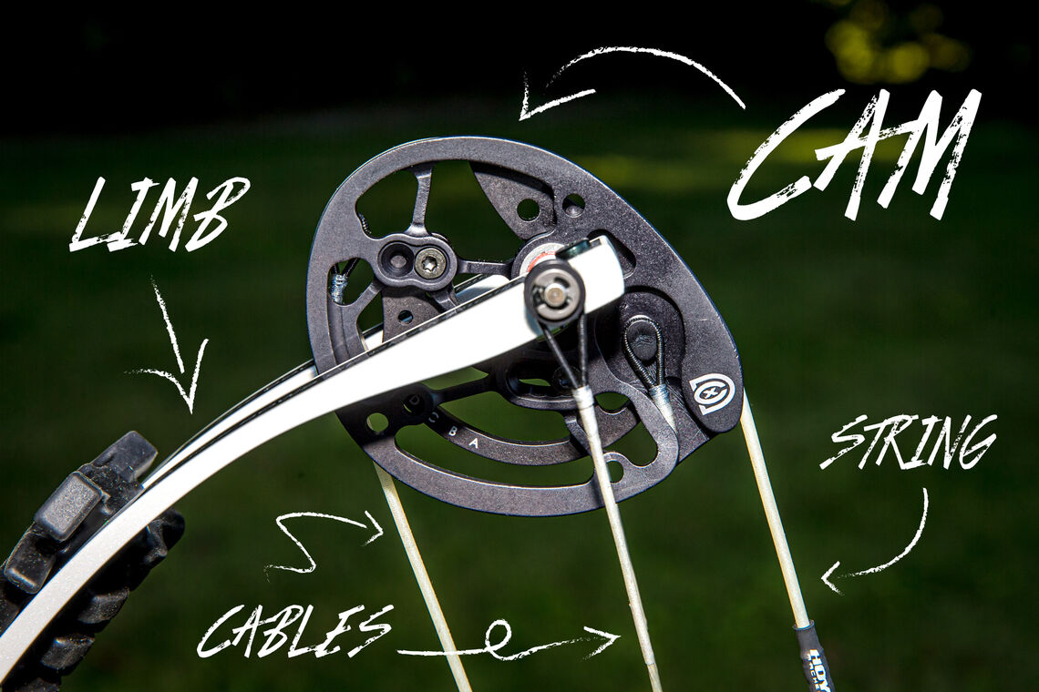 Le manche d’un arc à poulies est la poignée centrale qui sert de base aux branches. À l’extrémité de chaque branche se trouvent des poulies, généralement excentrées et appelées cames, qui sont reliées par des câbles et la corde d’arc. Les cames ont des poids de tirage, des longueurs d’allonge et des let-offs maximums spécifiques. Le let-off est le pourcentage de réduction de poids à pleine allonge (effet de la démultiplication de la puissance de l’arc.)