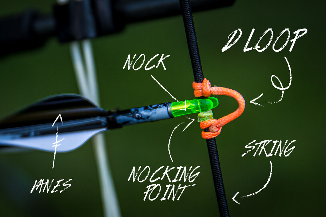 Les flèches sont fixées sur la corde d’arc contre un repère d’encoche et généralement à l’intérieur d’un D-loop, un matériel court en forme d’arc utilisé pour se relier au décocheur lors de la traction de l’arc. La flèche tient à l’arc sur la lame d’un repose-flèche.