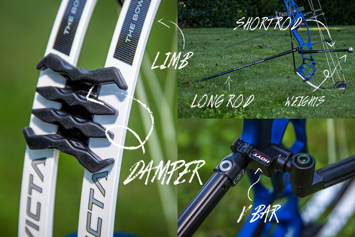 Des stabilisateurs, y compris les tiges longues qui dépassent à l’avant de la poignée, et les tiges courtes qui dépassent sur les côtés ou à l’arrière, généralement terminées par des poids, sont utilisés principalement pour équilibrer l’arc lors de la visée. Avec les amortisseurs, ils permettent également de réduire les vibrations lorsque la flèche est libérée.