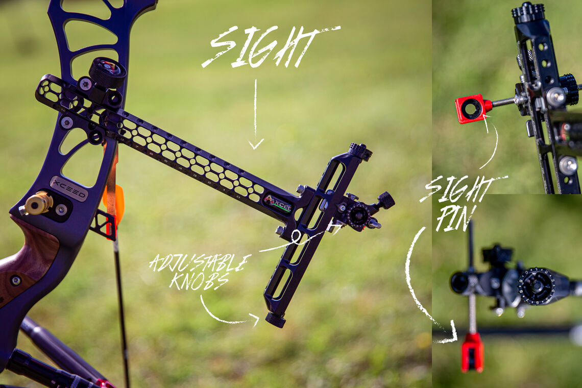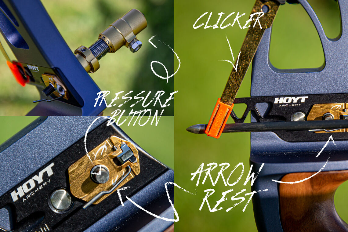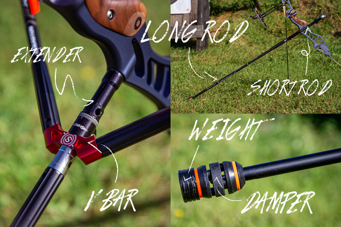 Un viseur réglable est également fixé à la poignée et supporte un œilleton, que l’archer utilise pour viser la cible. Les stabilisateurs, y compris les tiges longues qui dépassent à l’avant de la poignée, les tiges courtes qui dépassent sur les côtés ou à l’arrière, et les amortisseurs, aident à équilibrer l’arc et à réduire les vibrations lorsque la flèche est libérée.