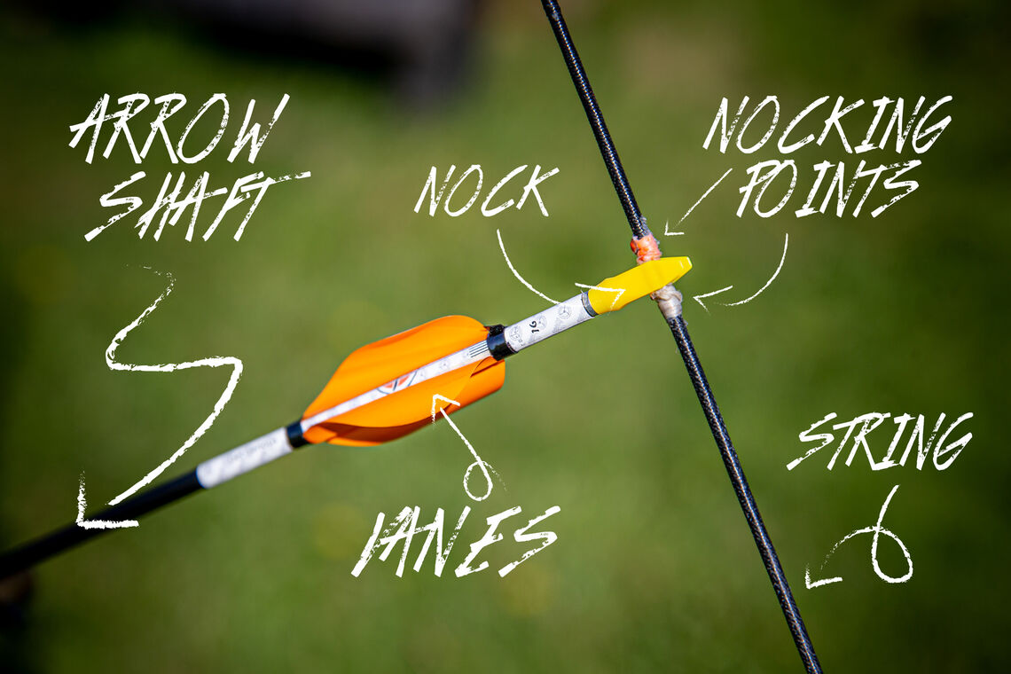 Les flèches se fixent sur la corde de l’arc entre les repères d’encoche, qui sont des marques fixées sur la corde. Elles tiennent à l’arc sur un repose-flèche et généralement contre un bouton berger et sous un clicker, dispositif qui permet de vérifier l’allonge. Le bouton amortisseur est un ressort qui appuie sur le tube de flèche et garantit que la flèche vole droit lorsqu’elle quitte l’arc, en réduisant l’ondulation horizontale causée par les doigts qui lâchent la corde. (Ce phénomène étant connu sous le nom de paradoxe de l’archer).