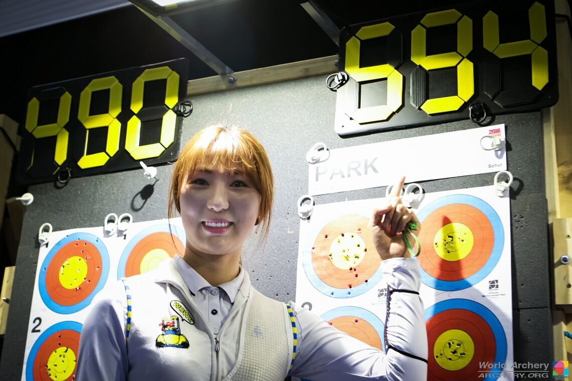 Park, qui tire à la troisième étape de la Coupe du Monde de tir à l'arc en salle pour l'équipe professionnelle coréenne LH, a réussi 297 à ses 30 premières flèches, puis a fait encore une fois 297, pour un total de 594 sur 600. Elle a fait deux fois 30 parfaits dans les deux dernières volées.