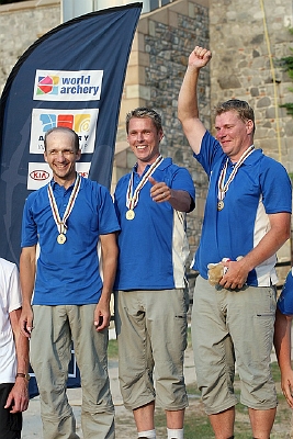 La dernière cible était à 50m pour les arcs nus, 60m pour les classiques et poulies, avec à nouveau un angle aigu en tirant sur le haut. MEYER-LAUBE-RORHBERG ont fini avec 2-5-6 et un total de 50 points. La tête de série no 5 finlandaise composée de TARHALA-HAAVISTO-AHJOKIVI ont conclu avec 6-5-4. Un total de 56 et une surprenante mais méritée médaille d’or pour la Finlande!