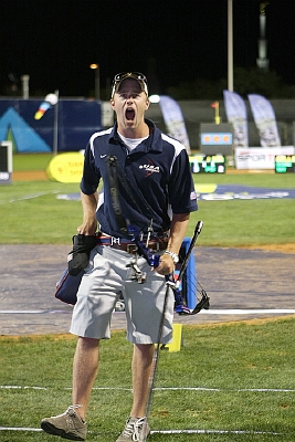 A Ogden, KIM a commencé son match de la plus belle des façons avec 30 points pour prendre la tête 2-0. OH n’a pas été très stable au deuxième set avec 9-10-7, ce qui a permis à KIM de le dépasser (x10-9-10) et d’empocher deux points de set pour mener 4-0. Mais un 9 a coûté à KIM le troisième set, perdu 29-30. Les deux archers ont tiré 28 points au quatrième set, puis 27 au cinquième. KIM menait 5-3 puis 6-1. Médaille d’or pour le jeune Coréen!