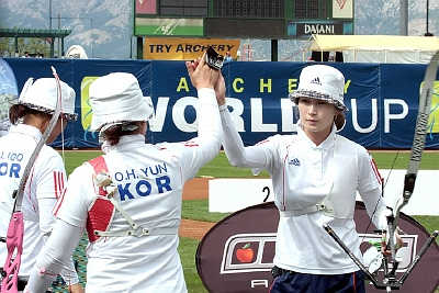 A Ogden, la paire coréenne a pris la tête d’entrée, 35-34 (X10-8-8-9 contre 9-9-7-9). Les Britanniques ont joué de malchance à la deuxième volée : x10-9-3-8. Naomi FOLKARD a certainement été gênée par le vent, ce qui a permis aux Coréens de mener 71-64. Les scores de la troisième volée montrent à quel point les filles ont eu de la peine à ajuster leur tir dans le vent. Naomi FOLKARD a tiré 7-3 alors que TERRY a fait 10-10; du côté coréen, KIM n’a fait que 5-8 contre 9-8 pour OH. La Corée menait 101-94. La Grande-Bretagne a élevé son niveau à la dernière volée (8-7-10-10) mais c’était trop tard pour revenir sur la paire adverse, qui a tiré 8-9-10-6. Victoire et médaille de bronze pour OH et KIM!