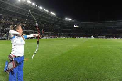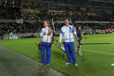 Les Championnats du Monde de Tir à l’Arc et de Tir Handisport 2011 approchent. Pour promouvoir ces événements qui auront lieu à Turin (Italie) du 3 au 17 juillet 2011, les archers italiens Marco GALIAZZO, Natalia VALEEVA, Oscar DE PELLEGRIN et Elisabetta MIJNO ont tiré en démonstration le 9 mai pendant la mi-temps du match de football de Série A opposant Juventus et Chievo, le dernier match à domicile de la saison et également le tout dernier match joué au Stade olympique de Turin.Le champion olympique Marco GALIAZZO et la championne du monde Natalia VALEEVA ainsi que les athlètes paralympiques Oscar DE PELLEGRIN et Elisabetta MIJNO ont tiré deux matches exhibitions dans un contexte exceptionnel: la mi-temps d’un match de Série A du football italien.