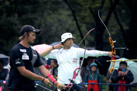 Le choc entre les deux Coréennes (championnes Olympiques par équipe, KI gagnant aussi l’or individuel) a tenu toutes ses promesses. CHOI a certes commencé avec un 3, probablement dû à la pluie et l’eau sur sa corde d’arc, mais KI était superbe lors des deux premiers sets avec 10-10-9 et 10-9-10. Elle menait 4-0.