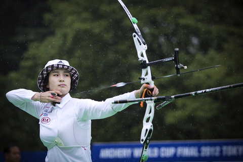 KUMARI a commencé le cinquième set avec un 9. KI a tiré un 8. L’Indienne marquait un 9. La Coréenne un 9. KUMARI avait un point d’avance et devait marquer un 10 pour gagner! Elle a tiré… un 7! Alors, KI devait, elle, tirer un 9 pour gagner! Elle l’a fait! Après ses deux médailles d’or Olympiques, KI est vainqueur de la Coupe du Monde de Tir à l’Arc 2012!