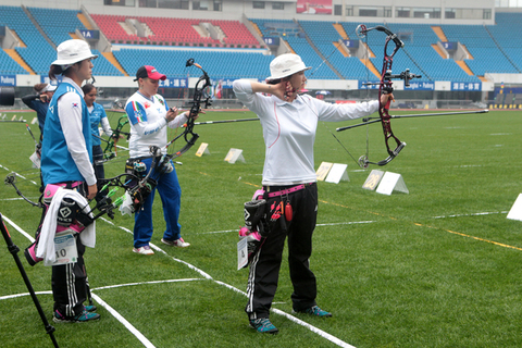 Les huitièmes de finale ont donné lieu à deux résultats inattendus : l’Australie a battu la Russie, et la Grande-Bretagne s’est inclinée devant Hong Kong. En quarts de finale, l’Inde (no 5) a tiré une superbe première volée (59 points) pour prendre les devants et finalement s’imposer sur le Mexique (no 4) par 230-224. La Corée (photo) a affiché le même total pour se défaire de l’Iran. Têtes de série no 1, les Américaines Carli COCHRAN, Erika JONES et Jamie VAN NATTA ont été encore plus précises (231) pour battre l’Australie de 15 points. L’Italie a égalisé ce score, grâce à son équipe composée de Katia D’AGOSTINO et des anciennes championnes de Shanghai Laura LONGO et Marcella TONIOLI. Après une quart de finale facile contre Hong Kong, l’Italie s’est mesurée à un adversaire beaucoup plus difficile en demi-finale: les surprenantes Coréennes. Les volées les plus faibles des Coréennes – 58 points – correspondaient à la meilleure volée des Italiennes ! CHOI Bomin, SEOK Ji Hyun et