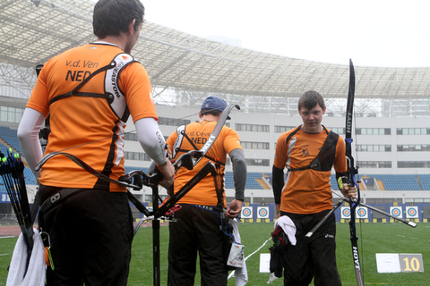 La seule des huit meilleures équipes à ne pas passer les huitièmes de finale a été le Japon, qui s’est incliné 207-221 devant la Malaisie (no 10). Comme prévu, la Corée a tiré le meilleur score de ce tour (226). En quarts de finale, les Coréens ont tiré 224 pour vaincre l’Italie (216). La Chine, no 2, emmenée par le médaillé de bronze olympique DAI Xiaoxang, s’est défaite de la Malaisie avec le deuxième meilleur total (223). Les vice-champions du monde Thomas AUBERT, Gaël PREVOST et Jean-Charles VALLADONT ont tiré 222 pour battre l’Inde, no 4, qui a connu une mauvaise première volée. Un quart de finale à rebondissements à opposé les Pays-Bas (photo), no 3, et les Etats-Unis, no 6. Après une égalité à 55-55, les champions d’Europe ont perdu trois points pour être menés 109-112. Mais une mauvaise troisième volée des Américains (51 points) a réduit l’écart à un point. Les vice-champions olympiques Brady ELLISON et Jake KAMINSKI ainsi que Joe FANCHIN ont été largement battus à la dernière volée (56 contre 59). Victoire 221-219 pour Sjef VAN DEN BERG, Rick VAN DEN OEVER et Rick VAN DER VEN!