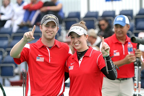 La finale du double mixte entre les Etats-Unis (no 1) et la Corée (no 2) a donné lieu à une belle bataille entre expérience et technique, avec d’excellents scores des quatre athlètes. Ce match a permis d’observer le contraste entre l’expression américaine, très dynamique, et la technique coréenne, plus proche de celle de l’arc classique, où rien ne bouge. Braden GELLENTHIEN et Erika JONES, tous deux en lice pour trois médailles aujourd’hui, ont pris le meilleur départ. SEOK Ji Hyun et MIN Lihong sont revenus à égalité avant les deux dernières flèches, mais ils ont ouvert la voie à leurs adversaires en terminant par deux 9. JONES a décoché un 9 elle aussi, mais GELLENTHIEN a sauvé son équipe de justesse en tirant le 10 (sur la ligne) dont elle avait besoin pour la médaille d’or! Victoire 155-154 pour les Etats-Unis.