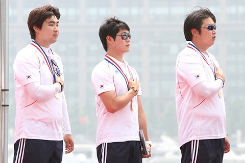 Le public chinois, comprenant la Membre du CIO Mme Yang YANG et l’ancienne star du basketball Yao MING, s’est enflammé lorsque son équipe masculine, emmenée par le médaillé de bronze olympique DAI Xiaoxiang, a fait son entrée sur le quai de la rivière Huangpu pour défier la Corée en finale. L’équipe coréenne comprenait LEE Seungyun, le champion olympique OH Jin Hyek, ainsi que le no 2 mondial IM Dong Hyun, quatrième de son pays en qualifications mais repêché pour son expérience. Les Coréens, qui communiquaient beaucoup entre eux et se livraient des informations sur la manière de viser sous le vent violent venant de la rivière, ont pris une avance de quatorze points à la première volée. Solides et réguliers, les Coréens n’ont pas laissé leurs adversaires les rattraper malgré le soutien du public chinois. Victoire 213-197 pour la Corée, qui signe un beau retour au sommet de la division masculine d’arc classique après sa perte du titre olympique l’an dernier.