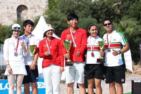 En finale du double mixte, KI Bo Bae et LEE Seungyun (No 1) ont été menés au score par les Chinois CUI Yuanyuan et XING Yu (No 2), mais sont revenus avant la dernière volée. La Chine a fait la différence sur les deux dernières flèches, pour quelques millimètres. Victoire 152-151 et deuxième médaille d’or du jour pour CUI! Dans le match pour le bronze, le Mexique (No 5) accusait un point de retard sur la Grande-Bretagne (No 14) après une volée. Mais Aida ROMAN et SERRANO, quatrièmes à Shanghai, ont ravi l’avantage à leurs adversaires. Après trois dernières flèches hésitantes, SERRANO devait faire un 8 pour gagner, et il y est arrivé de justesse. Victoire 142-141 pour le Mexique.