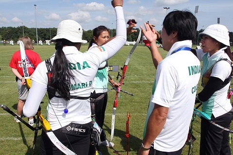 Chez les femmes, la Corée a été de loin la meilleure équipe. YUN Ok-Hee, KI Bo Bae et CHANG Hye Jin n’ont jamais tiré moins de 222 points en trois matches : elles sont battu les Etats-Unis, l’Italie et la Russie et accèdent à la finale. Championnes à Medellin, les Indiennes Deepika KUMARI, Bombayla Devi LAISHRAM et Rimil BURIULY (photo) ont dominé l’autre côté du tableau. Leurs victoires sur l’Indonésie, le Mexique et enfin le Danemark leur offrent une nouvelle chance de médaille d’or. Le match pour le bronze opposera la Russie au Danemark.