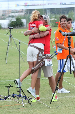 Cette confrontation entre les Etats-Unis et l’Italie est un classique. Sur le papier, elle opposait deux équipes très fortes, mais inégales dans l’approche du tir en double mixte. Les archers italiens sont devenus champions du monde ensemble et ont remporté deux étapes de Coupe du Monde cette saison. De l’autre côté, la paire américaine tirait ensemble pour la première fois : JONES, très expérimentée et souvent médaillée en double mixte, était associée à BROADWATER, qui n’avait jamais pris part à cette épreuve auparavant.