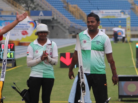 Les demi-finales ont été peu animées, avec des victoires sans encombres pour la Corée et l’Inde : CHOI et KU ont vaincu ROCHAWATI et AGATHA 154-139, tandis que TAN et KU n’ont pas pu donner une nouvelle chance de médaille d’or au Taipei chinois, battus par KUMARI et TALUKDAR 153-144. TAN et KU avaient gagné la première médaille de l’après-midi pour le Taipei chinois grâce au bronze obtenu contre l’Indonésie. La médaille d’or est désormais propriété de l’Inde, et de KUMARI et TALUKDAR (photo), avec un score de 146-141 sur la Corée.