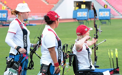 Avec la Russie (photo) et le Japon ayant gagné un bye pour les demi-finales, Turquie vs. Iran et Etats-Unis vs. Ukraine étaient au programme des quarts de finale ; Asiatiques et Américains n’ont eu aucun problème pour obtenir leur qualification dans le dernier carré. Martha CHAVEZ, Arce HESS et Ashlee SHEPPARD ont ensuite gagné leur place en finale après une victoire de cinq points sur les Japonaises Nako HIRASAWA, Chieko KAMIYA et Miho NAGANO, 200-195. Dans l’autre demi-finale, la Russie a atteint une double performance ; tout d’abord en marquant le meilleur score de la journée avec une victoire sur l’Iran et la qualification en finale, et ensuite parce que leur score de 218 points est le nouveau record du monde dans un match à 24 flèches.