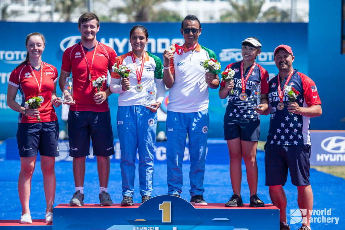 USA's Gabrielle Sasai and Brady Ellison with their bronze medals at Antalya 2022