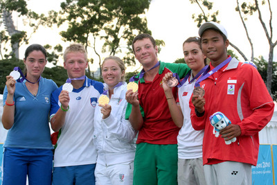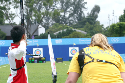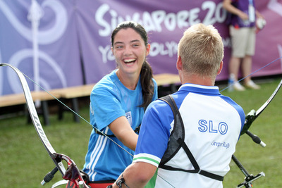 Quarts de finale SONG Jia (CHN) / PIANESI Lorenzo (ITA)vs Zoi PARASKEVOPOULOU (GRE) / Gregor RAJH (SLO)La pluie s’est arrêtée de tomber alors que les archers sont entrés sur le terrain l’après-midi pour tirer les quarts de finale. Les deux équipes en lice dans ce premier match présentent un archer qualifié pour les 1/8e de finale individuels: la Chinoise et le Slovène. L’équipe Chine/Italie a eu des tirs plus groupés pour remporter le premier set (8-8-9-8 contre 7-9-7-8) et mener 2-0. Les deux équipes ont élevé leur niveau au deuxième set, SONG/PIANESI ont tiré 9-9-9-8 et leurs adversaires 10-9-6-8. Le score est passé à 4-0. Tirant les premiers, PARASKEVOPOULOU/RAJH ont fait un bon troisième set (x10-7-8-10) que SONG/PIANESI ne sont pas parvenus à égaliser. La paire sino-italienne 4-2. Comme les deux garçons ont tiré les mêmes scores au quatrième set (9-7), ce sont les filles qui ont fait la différence: la Chinoise a tiré 9-7 et PARASKEVOPOULOU 9-10 pour remporter le set et revenir à 4-4. La paire SONG/PIANESI n’a tiré que des 8 pour conclure son match, pas assez pour battre les 8-8-8-9 de leurs adversaires, qui ont gagné le match 6-4. La paire gréco-slovène a éliminé l’équipe de Chine/Italie, deux grandes nations du tir à l’arc! Dès les quarts de finale, nous avons reçu les commentaires du médaillé de bronze des Jeux Olympiques de Sydney 2000 Wietse van ALTEN, qui est à Singapour en tant qu’Athlète Modèle et entraîneur de l’équipe hollandaise:Aujourd’hui les entraîneurs n’ont pas le droit d’accompagner les archers sur le terrain. Les archers n’y sont pas habitués, mais c’est sympa de voir qu’ils s’entraident avec succès. Miriam ALARCON (ESP) / Md. Emdad HAQUE MILON (BAN)vs Alice INGLEY (AUS) / Tsukushi KOIWA (JPN)L’équipe composée d’ALARCON/HAQUE MILON a pris le meilleur départ avec 35 points, alors qu’INGLEY/KOIWA n’ont tiré que 28 (3-8-10-7) pour être menés 0-2. Il y a eu quelques erreurs également au deuxième set: 5-3-7-8 (23) pour ALARCON/HAQUE MILON, 8-4-6-10 (28) à leurs adversaires. INGLEY/KOIWA ont ainsi fait un beau retour à 2-2, puis 4-2. Au quatrième set, les deux équipes ont tiré un 6, un 8 et deux 9, et le score est passé à 5-3.L’équipe d’Espagne/Bangladesh est revenue au dernier set (8-9-10-9 contre 6-9-8-7) pour arracher l’égalité. En barrage, cette paire a tiré 8-6. Après qu’Alice INGLEY a tiré un 8, Tsukushi KOIWA n’avait besoin que d’un 7 pour offrir la qualification à son équipe, mais il a probablement craqué sous la pression et n’a pu faire qu’un 4. Victoire pour ALARCON/HAQUE MILON! Wietse van ALTEN: Tous les archers tirant ce match sont qualifiés pour les 1/8e de finale individuels, on a donc deux équipes très fortes sur le papier. L’Australienne a fait un beau retour, de 3 à 10 dans la première volée. C’est quelque chose de très courant chez les jeunes archers: ils savent tirer de très bonnes flèches mais on voiten voit aussi de très mauvaises. C’est la principale différence entre juniors et seniors. De plus il y a du vent sur le terrain et les archers ne savent pas trop comment gérer ça, comment contre-viser. Ce sont des choses qui s’apprennent, qui viennent avec l’expérience. Ce qui est arrivé à la dernière flèche était très inattendu, c’est certainement la pression et le fait que les jeunes archers n’ont pas l’habitude de tirer devant un public et des caméras. Je suis désolé pour KOIWA. Brina BOZIC (SLO) /Benjamin NOTT (AUS)vs Begunhan Elif UNSAL (TUR) and Abdud DAYYAN (SIN)Le premier set a été le meilleur de la journée: BOZIC/NOTT ont tiré 9-10-9-9 et UNSAL/DAYYAN 10-9-10-9. La paire Turquie/Singapour, favorite du public, menait 2-0, puis 4-0. Au troisième set, Benjamin NOTT a tiré deux 10 qui ont aidé son équioe à revenir 2-4. Cependant UNSAL/DAYYAN ont gagné le quatrième set 36-35 et le match 6-2, pour le plus grand plaisir du public de Singapour. Wietse van ALTEN:Nous avons assisté là au plus beau match de la journée en termes de scores. Les archers ont très bien tiré, en particulier l’archère turque et l’Australien. C’est super de voir de jeunes archers tirer si bien. Je suis impressionné. Je pense qu’il faudra surveiller ces archers lors des finales individuelles. Irina HUL (BLR) / LUO Siyue (CHN)vs Gloria FILIPPI (ITA) / Anton KAROUKIN (BLR)Deux compatriotes étaient opposés dans ce dernier quart de finale: les Biélorusses Irina HUL et Anton KAROUKIN. Même si aucun des quatre archers n’est encore en lice dans la compétition individuelle, ils ont montré un très bon premier set, remporté par FILIPPI/KAROUKIN 37-34. La jeune Italienne a attaqué le deuxième set avec un 1 qui a offert les 2 points de sets à HUL/LUO. Le public a retenu son souffle au troisième set quand Anton KAROUKIN a tiré la flèche finale à la toute dernière seconde, un 9 pour gagner le set 36-34. L’équipe Italie/Belarus menait 4-2. Au quatrième set, l’équipe de Belarus/Chine a tiré 7-7-7-10 et a été battue par celle d’Italie/Belarus, 10-10-9-9. Victoire 6-2 pour FILIPPI/KAROUKIN! Wietse van ALTEN:L’équipe gagnante a très bien tiré avec une seule flèche en dehors du jaune. C’était un 1, mais ça ne les a pas empêchés de gagner.