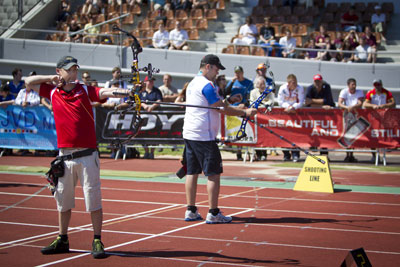 Martin DAMSBO (DEN) and Sergio PAGNI (ITA) in Amsterdam The World Games will be held in Cali, Colombia in 2013, for both the compound men and women. The recent African Championships, European Championships, and Panamerican Championships were used as Continental Qualifiers. The outdoor target archery competition of the 2013 World Games will feature only the compound division (field archery is also on the programme of the World Games – details on the competition format can be found here). Twenty-four men and twenty-four women will qualify for the compound competition, where three podiums will be awarded – men, women and mixed team. A total of nine places per gender have already been allocated. Three Continental Qualifiers have already taken place: the 2012 African Championships allocated four spots (two per gender), the 2012 Panamerican Championships awarded six spots (three women and three men), and there were six spots (three per gender) up for grabs at the European Championships in Amsterdam, where several world-class archers were present. At the African Qualifier in March, Petrus MARX won a spot for South Africa by placing first in the men’s event. The second position for the World Games went to Namibia, thanks to a good performance and the second rank by François MARAIS. Namibia won two more positions in the women’s competition, thanks to Beanta VIVIERS and Iroleen VAN LITZENBORGHPAGE, who placed first and second, respectively. At the European Championships in Amsterdam in late May, the individual champion Sergio PAGNI won a spot for Italy; the runner-up Martin DAMSBO claimed one for Denmark; the third and final spot went to Germany thanks to Paul TITSCHER’s third-place finish. On the women’s side, the individual gold medallist Kristina BERGER acquired a place for Germany, while Italy won two spots thanks to Anastasia ANASTASIO and Marcella TONIOLI, who finished second and third. Our review of the Americas World Games Qualifier, which took place in late May, can be found here. So far the host nation Colombia has four spots, Italy and Namibia have three, El Salvador and Germany two, while Denmark, South Africa, the United States, and Venezuela have one. Summary of Places for World Games 2013 in Cali (Colombia): Ø Compound Men Ø Compound Women At the World Games, the compound athletes will shoot the 50m Round in qualifications: 72 arrows at 50 metres on a target face with six scoring rings (10-5 points). Each arrow out of the 5-point ring is considered as a Miss (0 point). The score is cumulative. At the end of qualifications, the athletes or teams are paired on a match chart based on their ranking (byes may be awarded). Individual athletes will play matches of 15 arrows with cumulative score; in case of a tie, a shoot-off of 1 arrow will be played. Mixed teams will play matches of 16 arrows (8 per archer) with cumulative score; in case of a tie, each archer shoots 1 more arrow for the best cumulative score; if the score is still tied, the arrow closest to the centre defines the winners. World Archery Communication
