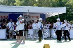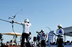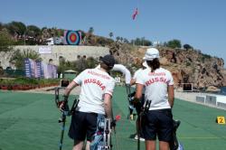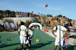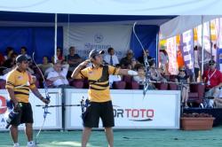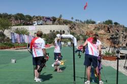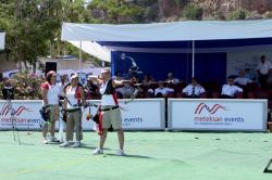 Médaille de bronze: TURQUIE - CHINESE TAIPEILes athlètes du Chinese Taipei, Kuo, Chen and Wang, prennent un bon départ avec 29 pts (10-9-10). Leurs adversaires locaux marquent 8-8-7 et sont menés de 6 pts (23). L'équipe du Chinese Taipei augmente son avance avec 9-7-10 (55). La Turquie tire 7-9-9 (48) et se retrouve 7 pts derrière. Orbay, Satir et Kucukkayalar tirent en premier dans la deuxième séries de six flèches. Ils totalisent 75 pts avec 7-10-10. Le Chinese Taipei prend 9 pts d'avance avec 10-9-9 (83). Cependant, il ne leur reste plus que 51 secondes pour tirer leur trois flèches suivantes... L'équipe local atteint la mi-match avec un total de 103 après avoir tiré 10-9-9. Pressés par l'horloge, les archers du Chinese Taipei réussissent quand même à marquer trois 10 pour garder leur confortable avance (113). Ils poursuivent avec une autre volée parfaite (10-10-10) et asphyxie leurs adversaires (9-10-7 pour les Turcs). L'écart passe à 11 pts (169-158) avant les six dernières flèches. N'ayant plus rien à perdre, les locaux retrouvent leur calme et marquent 10-10-9 (187). Le Chinese Taipei fait 10-9-9 et perd 1 point (197). La Turquie termine sur une autre belle série de 10-9-9 et un total de 216 pts. Avec 9-9-10 (225), Kuo et ses coéquipiers offrent la médaille de bronze au Chinese Taipei!