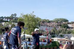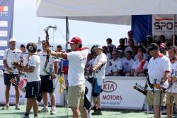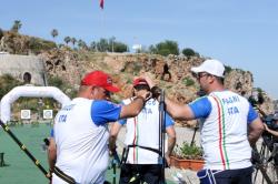 Médaille d'or: USA - ITALIEPagni débute pour l'Italie avec un 9. Tosco poursuit avec 10 et Mazzi avec 8 (27). Gatto, Schiavo et Gellenthien ouvrent leur match avec 10-9-10 (29). L'équipe américaine prend 2 pts d'avance. Leurs adversaires européens marquent 9-9-10 (55). Ceux-ci se retrouvent menés de 3 pts après que les Américains aient tiré deux autres 10 et un 9 (58). L'Italien Pagni marque un 10, alors que Tosco suit avec un 9 et Mazzi avec un 10 (84). Les Americains perdent un point en faisant 10-9-9 (84). L'équipe d'Italie met la pression avec une volée parfaite (10-10-10) et 30 points supplémentaires (114). Les USA répondent avec trois 10 également et gardent leur courte avance (116). Un autre 10-10-10 pour l'Italie! Les Américains tirent 10-10-9 et laissent les Italiens revenir à 1 point (145-144). Avec 10-10-9, l'Italie totalise 173 pts. L'équipe américaine reprend 2 points d'avance avec trois 10 (175). Pagni et ses coéquipiers débutent la dernière volée avec 9-10-10 (202). Ils égalisent après que les Etats-Unis aient tiré 9-8-10 (202). Les Italiens terminent avec 10-9-10 et un score de 231 pts. Gellenthien et ses compatriotes terminent leur match avec 9-10-10 (231) pour aller en barrage! Pagni fait 10, Tosco 10 et Mazzi 9 (29 pts). Gatto et Schiavo font tous deux 9 et l'Italie remporte l'or avant même que Gellenthien ait tiré sa flèche (10)! L'Italie bat les Etats-Unis 29-28 au tie-break.