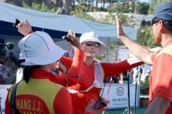Médaille d'or: COREE - CHINESE TAIPEIJoo, Park et Yun démarrent cette finale pour la Corée en marquant 7-9-9 (25). Wei, Wu et Yuan du Chinese Taipei sont menées d'un point avec 9-8-9 (26). La Corée poursuit avec trois 9 et un total de 53. Le Chinese Taipei égalise en tirant 10-9-9 (53). La championne olympique Park, la nouvelle recordwoman du monde (match à 12 flèches) Yun et leur compatriote Joo continuent avec un autre 10 et deux 9 (81). Elles prennent un léger avantage d'un point. Les Coréennes augmentent leur avance à mi-parcours avec 8-10-10 (109). Yuan et ses coéquipières marquent 9-9-8 et sont menées de 3 pts (106). Wei poursuit avec un 10, Wu avec un autre 10 et Yuan avec 7 pour un total provisoire de 133. L'équipe de Corée tire une autre magnifique série avec 10-10-9 et prend le large (138). Les archères du Chinese Taipei marquent 27 points supplémentaires (10-8-9/160). L'écart se stabilise, la Corée faisant trois 9 (165). Le Chinese Taipei débute la dernière volée de six flèches avec 9-9-10 (188). La Corée poursuit avec 10-9-9 (193) et garde son avance de 5 pts. Le Chinese Taipei termine sur 7-9-9 et 213 pts. Les favorites coréennes remportent finalement une victoire aisée avec deux 9 et un 10 (221)!