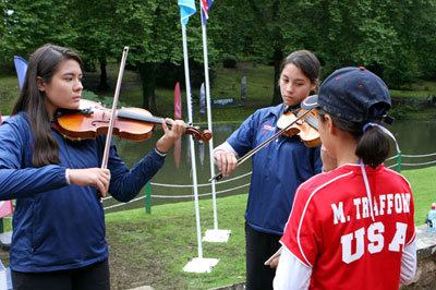 Interview de la famille TRAFFORD, six archers qui ont participé aux Championnats du Monde en Campagne Llwynypia – 16 septembre 2008 La famille Trafford à Llwynypia Aux récents Championnats du Monde en Campagne à Llwynypia (GBR), nous avons eu la chance de rencontrer une incroyable famille de six membres qui font tous de la compétition! Explications avec Skip TRAFFORD, le père. Skip, comment est-ce possible que la famille toute entière tire dans ce tournoi? En fait, ça fait 47 ans que je fais du tir à l’arc. J’ai eu le plaisir de faire la connaissance de l’ancien président de la FITA Jim Easton et même de son père. Quand j’ai rencontré ma femme Charlene, je me suis rendu compte que le seul moyen pour moi de continuer à tirer était qu’elle se passionne elle aussi pour le tir à l’arc. Par chance, elle était déjà sportive (faisant du basketball) et elle s’est mise à vraiment aimer tirer. Quand à nos trois filles, Rachael, Heather et Miriam, ainsi que notre plus jeune fils, Hardy, on leur à mis un arc dans les mains plutôt rapidement, et apparemment ils ont aussi apprécié! Même si certaines catégories ne sont pas officielles ici, on a tous eu la possibilité de gagner sa place dans l’équipe américaine. Ca peut avoir l’air d’un voyage familial, mais en fait, on prend cette compétition très sérieusement. Avez-vous déjà fait ça avant? Oui! J’ai voyagé et habité à l’étranger durant longtemps en raison de mon travail (colonel de l’armée à la retraite, maintenant dans le commerce d’acier). Par exemple, j’ai habité durant six ans à Budapest et on a eu la chance de faire des tournois en Europe de l’Est, dont les Championnats du Monde en Campagne de 2004 en Croatie. On a aussi participé à une compétition majeure en Afrique du Sud. Encore une fois, même si c’est une magnifique expérience familiale, on ne le prendre as du tout comme des vacances. On veut faire le mieux possible. Comment faites-vous pour tous être prêts pour la compétition tôt le matin? Eh bien… Ca demande un peu d’organisation, mais je dois vraiment remercier ma merveilleuse femme et les enfants. Parfois, Hardy et moi on doit vraiment se dépêcher dans la salle de bain pour laisser la place aux filles, mais de manière générale, elles se débrouillent très bien pour être prêtes à temps. J’imagine que quand vous êtes passionné par le tir à l’arc, ça vous aide à sortir tôt, prêt à tirer sur le parcours. Talents multiples: Rachael et Heather jouent l'hymne national américain
