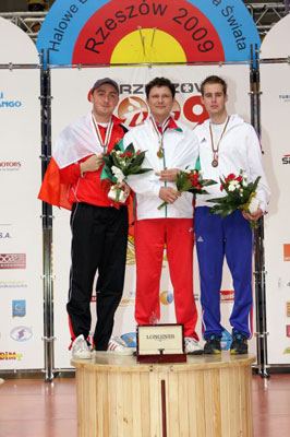 Classique HommesL'archer local GOLY (POL), tête de série no 31 seulement, avait créé la surprise dans les tours précédents pour remporter le droit de se battre pour le bronze face à la tête de série no 9, le Français VALLADONT. Soutenu par de nombreux fans, GOLY prenait un départ parfait avec trois 10 dans la première volée. Il menait alors de 2 points devant VALLADONT, 30-28. Mais le Français refaisait une partie de son retard (57-58) grâce à une volée de 29 points contre 28 pour le Polonais. Tous deux réussissaient alors une troisième volée parfaite avec chacun trois fois 10. L'écart entre les deux athlètes était stabilisé à 1 point en faveur de GOLY. VALLADONT et GOLY faisaient ensuite tous deux 10 et 9. VALLADONT terminait avec un 10 et il fallait donc un 10 à GOLY pour l'emporter... mais celui-ci marquait 9 et il y avait donc égalité. Tie-break! Le Français et le Polonais tiraient alors exactement la même flèche au premier tir de barrage, un 9, et il en fallait donc un deuxième. Après un 10 chacun au deuxième shoot-off, c'est la toute dernière flèche de barrage qui allait décider du médaillé de bronze! Tirant le premier, VALLADONT réussissait alors un 10 parfait en plein centre, et cette fois, c'en était trop pour GOLY qui faisait 9. Tête de série no 4, le local DOBROWOLSKI (POL) était le favori de son match pour la médaille d'or. Face au no 22 HRISTOV (BUL), le Polonais débutait le match avec une première volée parfaite et prenait 2 points d'avance, 30-28. L'écart entre les deux archers se stabilisait dans la deuxième volée. DOBROWOLSKI et HRISTOV faisaient en effet deux 10 et un 9 chacun et le score à la mi-temps était de 59-57 pour DOBROWOLSKI. Le Polonais et le Bulgare poursuivaient sur leur lancée avec une volée parfaite pour chacun d'eux. DOBROWOLSKI gardait la tête 89-87. Après un 10 et un 9 chacun, HRISTOV terminait le match avec un 10 mettant la pression sur son adversaire. Avec 10 ou 9, DOBROWOLSKI remporterait le match... mais il faisait alors un 8 (!) et voyait son adversaire revenir à égalité! Le premier tir de barrage était un 10 pour le Bulgare. Soutenu par une foule polonaise bien bruyante, son adversaire pouvait cette fois soutenir la pression et faisait aussi 10. Cependant, un deuxième 10 de HRISTOV et c'en était trop pour DOBROWOLSKI... qui, avec un 9, laissait s'échapper le titre mondial. Classique Femmes Dans la finale pour la médaille de bronze, la tête n’a cessé de passer d’une tireuse à l’autre. La Française SCHUH menait tout d’abord 30-29 après la première volée. Mais la Japonaise HAYAKAWA, championne du monde en salle 2007, la lui reprenait et passait devant à 59-58 puis à 88-87. Dans la dernière volée, SCHUH profitait d’une mauvaise série (26 points) de son adversaire pour revenir et l’emporter d’un tout petit point (115-114). Après avoir remporté l’or par équipe plus tôt dans la journée, VALEEVA (ITA) aurait bien aimé ajouter une nouvelle médaille d’or à sa déjà longue liste de récompenses mondiales. C’était elle qui prenait le meilleur départ avec 29 points contre 28 pour WINTER (GER). Cependant, avec un 8 à sa quatrième flèche, l’Italienne laissait revenir son adversaire allemande qui ne faisait pas prier pour prendre la tête à la mi-match, 57-56. WINTER doublait même son avantage, 86-84, alors qu’il ne restait plus que trois flèches à tirer. Avec à son tour un 8 à l’avant-dernière flèche, l’Allemande offrait une ouverture à VALEEVA, mais l’Italienne ne pouvait faire mieux que 9. WINTER parvenait à soutenir la pression pour tirer le 10 indispensable pour la victoire! Podium Poulies Hommes