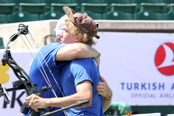CLELAND est le récent détenteur des records du monde sur l’Epreuve FITA et sur le match à 12 flèches. Il a réalisé un match parfait de 120 points avec sept X10 le 5 juillet! Il n’a pas atteint la perfection aujourd’hui mais il menait 88-86 après trois volées. VALVERDE a tout donné dans la dernière volée avec 10-10-10. CLELAND a fait un 9 et ne pouvait plus lâcher de point pour préserver sa victoire. Mission réussie ! Médaille de bronze sur le score de 117-116!