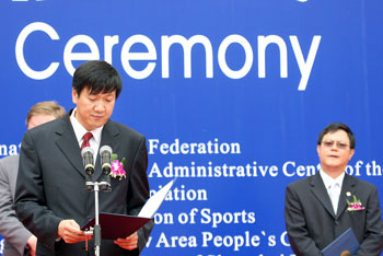 Quelque 250 athlètes de 35 pays se sont réunis au Stade de Yuan Shen dans le nouveau quartier de Pudong à Shanghai. Le drapeau chinois s’est élevé pendant l’hymne national, puis les membres distingués des autorités locales ont accueilli les participants. Les discours ont été émis par M. ZHANG Endi, député administratif de Pudong, M. GAO Zhidan (photo), Membre du Conseil de la FITA et directeur général de l’association chinoise de tir à l’arc, M. Tom DIELEN, Secrétaire Général FITA, et par M. YU Chen, directeur général de l’administration sportive de Shanghai.