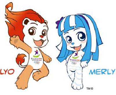 Lyo le lionceau incarne les valeurs olympiques que sont l'excellence et l'amitié, tandis que Merly le merlion – créature à tête de lion et corps de poisson – personnifie l'excellence et le respect.
