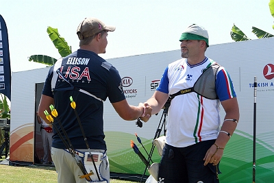 Braden espère certainement faire mieux qu’à la Coupe du Monde d’Antalya l’année passée, où il était deuxième. Aujourd’hui il a pris un départ parfait avec trois hits pour mener 2-0 devant son compatriote. Le niveau était très élevé avec un deuxième set parfait pour les deux archers. Un miss de Braden lui a coûté le troisième set, mais il a retrouvé la perfection au set suivant pour remporter le match 5-3.