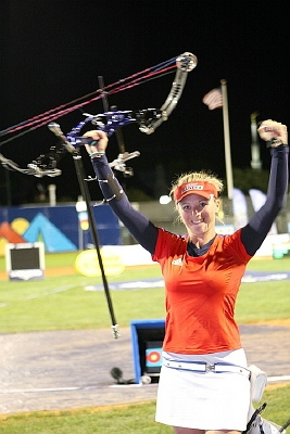 I changed my bow manufacturer this winter. It worked very well indoor, but I needed sometimes to adapt outdoor. I was 2nd in Antalya, and now I am very happy that I took the first place here in Ogden, on American soil! It seems that the Hit/Miss system is working well for me, but the fact is that 50m always has been a strong distance for me. I tied Peter ELZINGA world record on a few occasions. The Hit/Miss system still makes me a bit nervous. I guess it needs some times, but tonight it seems that the fans enjoyed it!