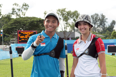 Singaporean archer Abdud Dayyan Bin Mohamed Jaffar hit a 10 with his final arrow in a tense shoot-off to secure the bronze medal in the mixed team event alongside partner Bengunhan Elif Unsal (TUR).