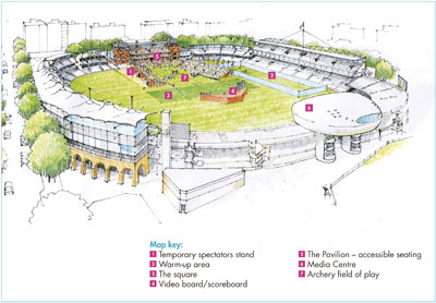 The action will take place against the backdrop of the historic Pavilion. Archers will shoot over "the square" towards the Media Centre. Spectators will be close to the action and will be seated in the temporary stands positioned on either side of the archers. Afterwards, all the temporary seats and structures will be removed.