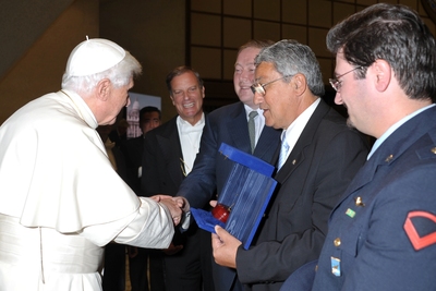 The Italian Archery Federation represented by FITARCO President Mario SCARZELLA, 2004 Olympic champion Marco GALLIAZO, and FITA Secretary General and FITARCO Honorary Member Tom DIELEN, had the honour to be presented to the Pope Benedict XVI during his audience on Wednesday at the Vatican.