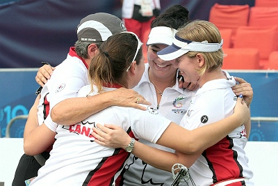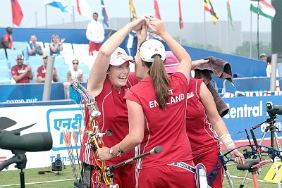 Three archers in this team final still have the chance to reach the individual final on Saturday: the No. 1 seed Doris JONES (CAN), the No. 2 seed Nicky HUNT (ENG) and the No. 14 Danielle BROWN (ENG). Canada has also in the line-up Ashley WALLACE, recent 2nd at the World Cup Final in Edinburgh last month, and Camille BOUFFARD-DEMERS, who won bronze at the Youth World Championships Antalya 2008. JONES is in fact the junior world champion from Merida 2006, where she beat BROWN in the semifinal. Canada’s team average age is only 22 years old. Both teams started well and the Canadians lead 58-57 after six arrows. Then both teams scored 58. Canada led 116-115 at the half (finishing the end with a bull’s eye); weather conditions were still perfect. Both teams did not leave the yellow again in the third end, but England was a bit better with a 58, while Canada had 56. The English took the lead 173-172. Shooting in the order of JONES/BOUFFARD-DEMERS/WALLACE, Canada then shot 9-10-10. England shot with BROWN/SIMPSON/HUNT in order and scored three 10s to increase their lead. JONES finished with a 10, BOUFFARD-DEMERS a 9 and WALLACE with another 9. Not enough at this level to truly put pressure on England. BROWN touched the bull’s-eye, SIMPSON had 9 and HUNT concluded with an X10 to take gold, 232-229! Twenty eight years after Neroli FAIRHALL (NZL), another para-archer, BROWN, won gold at the Commonwealth Games!