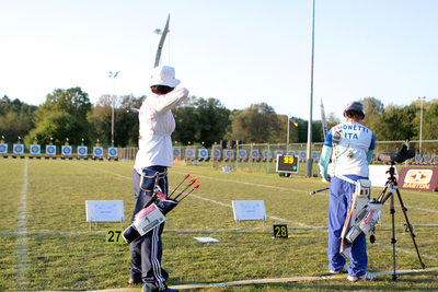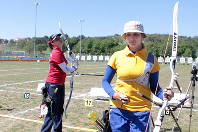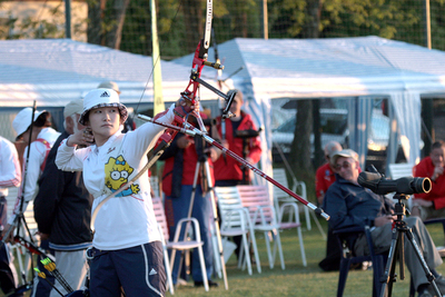 The young LIONETTI had the difficult task to face the No. 1 qualifier Korean JUNG. The Italian was in the lead 4-0 after two sets, but she started to shake a bit, shooting an 8 in the third set and a 7 in the fourth. JUNG tied up at 4-4. Nervousness could be felt in the last set, as both ladies scored two 9s and an 8 to remain tied. LIONETTI's shoot-off arrow was a perfect bull's eye (X10), so good an arrow that it was difficult to beat… Although following with a beautiful 10, JUNG could not excel her opponent's arrow and had to concede a surprising defeat. LIONETTI was 3rd in Porec in 2006 and 2nd in 2009. Will she finally be able to get a win here? The answer will be given on Saturday in the centre of the city.