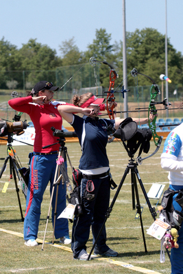 The 1/8 match between the 2007 and 2009 world champions, Albina LOGINOVA (RUS/5) and Eugenia SALVI (ITA/21), was cut short quickly after the first end already, as the Italian released a 5 at her second arrow! Although coming back a little in the second end with a perfect three arrows (52-56), she again seemed disturbed by the wind blowing stronger in the last two ends. Her opponent from Russia clinched a comfortable victory by 133-124. Another Russian, the No. 39 qualifier Viktoria BALZHANOVA defeated a higher rank archer in this round, Marcella TONIOLI (ITA/10), 133-131. The American ANSCHUTZ was given a hard time by the Indian HANSDAH. The two were tied 28-28 after the first end. The American took the lead 55-54 after six arrows but let it go after nine (81-82). The match was tied again at 109 each with one end two go and at 126 each with only one arrow to go. With a final 7 HANSDAH could not hope for victory as ANSCHUTZ released a final X10!