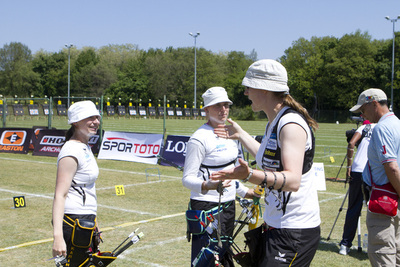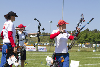 After losing to the No. 3 seeded team in the previous round, the No. 2 Italy could still hope for the compound women's bronze medal in Porec. But LONGO, SALVIA and TONIOLI trailed 53-55 after six arrows and later 109-112 after two ends and even 165-170 with one end to go. As their opponents from Russia finished with a 54-point final end only, the Italians could have hoped for recovery. For that they needed to shoot close to perfection. With a 57-point last end, they came back but not enough. Victory and bronze medal for AVDEEVA, BALZHANOVA and the reigning individual world champion LOGINOVA (224-222).