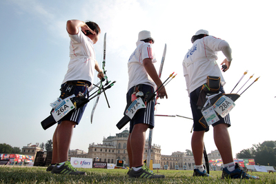 C'était le jour des éliminations par équipe dans la résidence de chasse de Stupinigi datant du 18ème siècle à Turin, Italie. Toutes les équipes ainsi que les doubles mixtes ont tiré les éliminations depuis les 1/8 jusqu'aux demi-finales. Le premier tour était critique pour les compétiteurs en arc classique. En effet, les huit premières équipes qui ont passé le premier tour remportaient trois places pour les Jeux Olympiques 2012 à Londres.