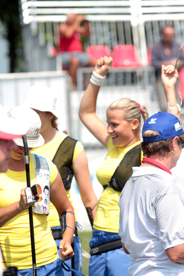 Quand la compétition a repris, les Ukrainiens MYLCHENKO/SICHENIKOVA/KOVAL ont marqué 8-10-9 au tie-break. Leurs adversaires polonais MOSPINEK/LIPIARSKA/LESNIAK ont tiré 9-9-8. Trop peu pour l'emporter. Dans l’autre tie-break, les hôtes italiennes, tirant avec SARTORI/TOMASI/VALEEVA, ont commencé par 8 et 7. L’équipe de Géorgie, constituée de NARIMANIDZE/DIASAMIDZE/ESEBUA, a débuté par 8 et 9. La troisième archère, Kristine ESEBUA, a tiré un 8 avant que Natalia VALEEVA ne s’apprête à tirer. L’Italienne savait donc exactement ce qu’elle avait à faire… rien de moins qu’un 10! Elle l’a réussi avec des nerfs d’aciers! Le tie-break s'est terminé à égalité à 25 chacun mais le 10 de VALEEVA était, forcément, la flèche la plus proche du centre.