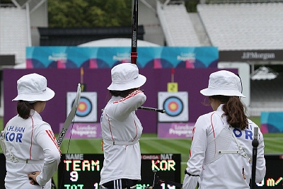 HAN Gyeonghee , JUNG Dasomi and KI Bo Bae beat the USA and Japan on the way to a gold medal win over the China team of CHENG Ming (CHN), FANG Yuting (CHN), XU Jing (CHN) just a day after the men were surprise losing finalists to the USA. The bronze medal match was won by Japan. Nami HAYAKAWA, her sister Ren HAYAKAWA and Kaori KAWANAKA overcame Great Britain. The British team of Naomi FOLKARD, Amy OLIVER and Alison WILLIAMSON had earlier caused a shock by beating second-ranked Chinese Taipei but they could not sustain that form against Japan. The matches are played with 4 ends of 6 arrows with cumulative scores. Here is a recap of the semifinals, bronze medal and gold medal match. Women 1/8 eliminations Women's teams 1/8 eliminations took place on Wednesday morning. In the first match the USA beat Ukraine after a shoot-off measurement. The score was tied at 200-200. Then both teams scored 27 in the shoot-off (both teams having a 10). After the judge measurement one arrow from the USA was the closest to centre, giving them the victory. Denmark easily defeated Georgia 207-195. Japan took revenge over Switzerland (they were defeated by the Swiss at the last World Cup stage in Shanghai), 213-207. Poland had a nice score (217) to defeat Belarus (202). Finally, the British hosts defeated the Italian world champions! Score evolution: 53-50, 104-100, 157-151, 203-200. Women Quarterfinals Women's team quarterfinals began in the afternoon session. Korea was not surprised by the USA this time (the American men won yesterday). The Korean ladies won 212-198. Japan dominated Denmark, 210-179. China played a close match against Poland and finally prevailed 56-55, 113-108, 164-159 and 215-212. Great Britain took a decisive lead over Chinese Taipei halfway through the match. The British led 108-100 and did not let go in the second half to win 208-200. Semifinal – Korea (KOR/1) v Japan (JPN/4) The No. 1 seeded Koreans took progressively the best of the No. 4 Japan. The favourites of Korea led 57-56, 114-111, 170-165 and finally won the match 225-217. Semifinal – China (CHN/3) v Great Britain (GBR/7) Amy OLIVER started well for Great Britain with a 10! However the team followed up with 8-8-8-7-8. China shot 8-9-9-10-9-9 to take the lead immediately 54-49. OLIVER shot two other 10s in the second end to help team going to 98 points. However China was again superior with 9-10-9-8-10-10 . The Chinese athletes had a comfortable lead half way through the match, 110-98. Great Britain shot better in the third end (9-9-9-10-10-9 – 56 points) to slightly come back, 154-165. However, the No. 3 seed China finished with 9-9-10-9-9-7 to win 218-203. Bronze – Japan (JPN/4) v Great Britain (GBR/7) Great Britain kept having problems with finding the yellow as OLIVER/WILLIAMSON/FOLKARD scored 8-9-6-8-9-7 in the first end. KAWANAKA/N. HAYAKAWA/ R. HAYAKAWA had 8-10-9-8-9-9 to take a strong lead 53-47. Great Britain however turned on the heat in the second end with 8-8-10-10-10-10, while Japan shot a 5 and 9-9-9-10-8. It was an even game, 103-103! The Japanese scored a 6 in the third end (very low in the target) with 10-9-9-8-10. The British shot 8-9-9-9-7-10. The match was still tied, at 155-155. Japan shot 9-10-9 with their first three arrows of the last end. Great Britain had 9-8-9. KAWANAKA/N. HAYAKAWA/ R. HAYAKAWA finished with 7-7-9. OLIVER/WILLIAMSON/FOLKARD finished with a… 3 and two 8s. Japan won the bronze medal, 206-200!