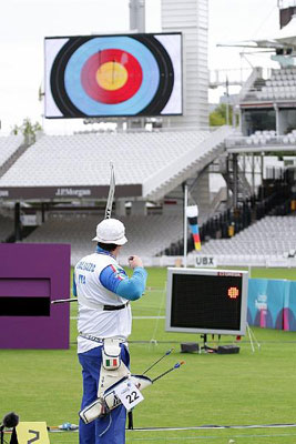 The Italian, who won in 2004 (Athens) and was team silver medallist in 2008 (Beijing), went out at the 1/32 eliminations, losing 5-6 to Anton PRILEPAU (BLR), who is ranked 206 in the world! There was nearly an upset in the women’s individual event with HAN Gyeonghee (KOR), the world No. 2, needing a shoot-off to make the 1/8 stage. HAN, who helped Korea to the gold medal in the team event on Wednesday, beat Kateri VRAKKING (CAN) 6-5 after putting herself in trouble with two uncharacteristic sixes. HAN hit a 10 in the shoot-off to confirm victory with the score tied at 5-5. Countrywoman KI Bo Bae (KOR) had no problems in her 1/16 eliminations as she only conceded one set point to Carina Rosenvinge CHRISTIANSEN (DEN) on the way to a 7-1 win. However, there was no escape for five-time Olympian Natalia VALEEVA (ITA) who paid for a slow start and lost to teenager Miranda LEEK (USA) 4-6 in the 1/16 eliminations. Both the Japanese men and women have been performing strongly this week and that was shown as Takaharu FURUKAWA (JPN) produced another winning show by coming back from two-sets down to upset DAI Xiaoxiang (CHN) 6-2. The athletes shot their 1/32 and 1/16 individual eliminations matches from Thursday to Saturday. The winners of the 1/16 will come back to Lord’s Cricket Ground on Sunday and Monday for the individual finals sessions. The matches are shot in the best-of-five sets format. Each set consists of three arrows and is worth two points; each archer gets one point in the case of a tied set. The first archer with six set points wins the match. In the case of a tied match at 5-5 in set points, a one-arrow shoot-off is shot. The winner is the archer whose arrow is closest to centre. Here are some key notes from the Saturday morning session's matches: - Pedro VIVAS ALCALA (MEX) won bronze at the Shanghai World Cup and finished 6th at the World Cup Final in Istanbul. Seeded No. 11 in London, he faced Maciej FALDZINSKI (POL/54) in the first match of the day. The Mexican pulled rank on his opponent. After a tied first set, he took the lead in the second and never let it go again to win 7-1. - After a slow start, the 2004 Olympic champion Marco GALIAZZO (ITA/22) found the 10-ring at his sixth arrow in 1/32 eliminations against Anton PRILEPAU (BLR/43). Tied at 2-2 after two sets, the two archers continued with three sets exactly the same for each (28, 26 and 29 apiece) for a tied score at 5-5. In the shoot-off, the Italian released a 9, but his opponent from Belarus scored a perfect 10 to clinch a surprising victory! - Two young ladies on the field for the first female match of the day. The 18-year old Miranda LEEK (USA/24) was 9th at the Youth World Championships this year and at the Youth Olympic Games in 2010. The American had a straight 3-set victory, 6-0, over Celine SCHOBINGER (SUI/41), 22 years old. - The advantage of the ranking was on VIVAS ALCALA's side (11) in his 1/16 round against PRILEPAU (43). But the latter could rely on the fact that he had just upset the 2004 Olympic champion GALIAZZO. The match was tied after three sets, 3-3, but the Mexican took the lead 5-3 before the final set and finally clinched victory 6-4. - The experienced Italian Natalia VALEEVA, many times medallist at World Championships and Olympic Games, seeded No. 9, was exempt from the first round. Against LEEK in 1/16, it took her five arrows to find her way to the 10-ring, and after trailing 0-2, she tied at 2-2. Again VALEEVA trailed 2-4 but came back 4-4. But in the final set, 28 by the Italian were not enough against the 29 by the 18-year old American for another upset! - Another face-to-face encounter between two young athletes: Haziq KAMARUDDIN (MAS/38), 18 years old, and TIEN Kang (TPE/29), turning 20 at the end of the month. With only three arrows out of the yellow in four sets, the youngest competitor won this 1/32 match 6-2. - Khatuna NARIMANIDZE (GEO/25) and Kateri VRAKKING (CAN/40), both 37 year old, were tied at 2-2 after two sets in 1/32 eliminations. The scores remained quite low in the first three sets (26 at the highest), and the Canadian was decisive in the fourth set with 28 for a 6-2 win. - Exempt from the first round, Juan Rene SERRANO (MEX/6) was mixed team's silver medallist at the World Championships in July. He faced the young Malay KAMARUDDIN, 18, in 1/16 elimination at the Test Event in London. While SERRANO shot three arrows out of the yellow in this match, KAMARUDDIN had only one out. Moreover, the latter scored a perfect 30-point fourth set to upset his more experienced opponent 6-2! - The No. 2 in the world and No. 8 seed in London HAN Gyeonghee (KOR), winner of the World Cup Stage 1 this year and world championships team bronze medallist, suffered from two bad 6 in the second and third sets and trailed 3-5 after four sets against the Canadian VRAKKING. The Korean managed to recover, however, to tie at 5-5 and get out of it thanks to a 10 in the shoot-off. - Siosifa TAUMOEPEAU (TGA/58), with no coach behind him on the field, had the difficult challenge to face DAI Xiaoxiang (CHN/7), silver medallist at the Istanbul World Cup Final two weeks ago. With two misses, two arrows in the white ring (1-2), three in the 5-ring and only two arrows in the red zone (7-8), the archer from Tonga could not hope for anything but a straight 3-set defeat against his opponent from China. - Two-time Olympian (Athens and Beijing) Takaharu FURUKAWA (JPN/26) trailed 2-4 after three sets against Aki VIRTANEN (FIN/39). But he recovered with only 10s and 9s in the final two sets, tied the match and finally clinched victory 6-4. - A 1/32 round between two young ladies: Kateryna YAVORSKA (UKR), 21 years old, made her international debut this year at the Ogden World Cup where she won the team event. The Ukrainian faced Carina Rosenvinge CHRISTIANSEN (DEN), 20, who finished 9th in the individual, team and mixed team events this year at the Youth World Championships. It was a closely-fought game that nee