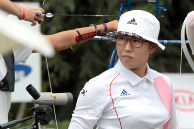 The Korean favourites placed their four ladies in the top 7 after the first half. The 2004 Olympic team champion and individual silver medallist LEE Sung Jin was 1st provisionally with 339 points. Her teammates CHANG Hye Jin and the new No. 1 archer in the world KI Bo Bae were 3rd and 4th with 336 and 334 respectively. The fourth representative, CHOI Hyeonju (3rd in Shanghai), was ranked 7th with 333. The 2012 world indoor champion and several time world champion Natalia VALEEVA (ITA) was 5th with the same score as KI.