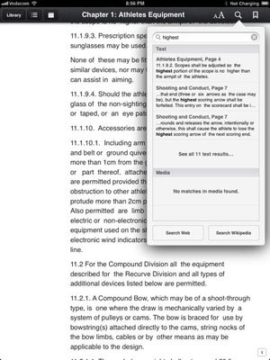 "On the other hand, the decision to put our most popular rule book (Book 3) on the iPad has a number of advantages for both the judge and the archer. The most significant is probably the search facility and the ability to bookmark any section, or to amplify any section or articles with notes. This makes for quick, easy retrieval and cross referencing of rules."