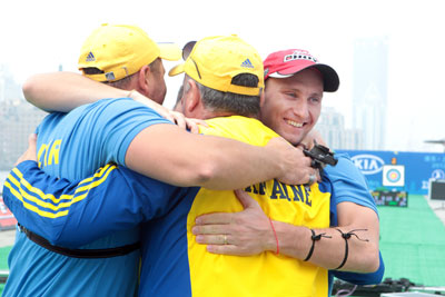 Viktor RUBAN took part in his first Olympic Games in Athens in 2004. In what was his first major international event, the 23-year-old was a member of the Ukrainian team that won the bronze medal. RUBAN secured a spot in the individual elimination round, but lost his 1/16 match to Laurence GODFREY (GBR) and finished 13th overall. Viktor RUBAN’s first international individual title came during the preparation period before the Beijing Olympic Games, in late June 2008 at the Boe World Cup. At the Beijing Olympic Games, RUBAN took part in the team event together with Markiyan IVASHKO and Oleksandr SERDYUK. Seeded No. 2 after qualifications, they were unable to defend their position from 2004, losing the semifinal to the eventual silver medallists Italy and the bronze medal to the host China. In the individual event, the native of Kharkiv finished the qualification round with a total of 678 points, just one point behind the leader Juan Rene SERRANO (MEX) and equally placed with Mangal Singh CHAMPIA (IND). This gave him the third seed for the individual elimination round. After easy victories in the early rounds, his first close match was the semifinal against Russia’s Bair BADENOV. The match ended in a tie at 112-112 after the regular 12 arrows were shot, requiring a first shoot-off (10-10) followed by a second, which RUBAN won 10-8. In the final he defeated the two-time team champion PARK Kyung-Mo 113-112 for the gold medal (see video at http://www.olympic.org/archery). RUBAN’s Olympic victory had a huge impact on the development of archery in Ukraine. RUBAN with teammates and coach at Shanghai 2012 World Cup