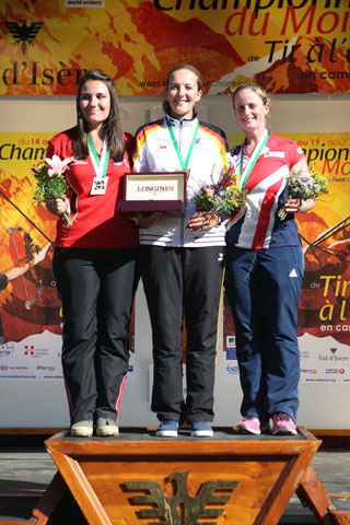 Elena RICHTER has had a good season this year. She won a team bronze medal at the European Championships and competed in her first Olympic Games in London. Right after the Games, she travelled to Val d’Isere, France for the Field World Championships. As the reigning European field champion, she was considered a favourite to win the world title. The event started very well for Elena RICHTER, who won the bronze medal as a member of the German team. Individually, the 23-year-old archer from Berlin shot solidly in the elimination rounds. She faced the world field youth champion Zoe GOBBELS (BEL) in the gold medal match. The German Olympian was very consistent, scoring 12 points on each target, for an easy victory 48-41. GOBBELS, RICHTER and Naomi FOLKARD (GBR)